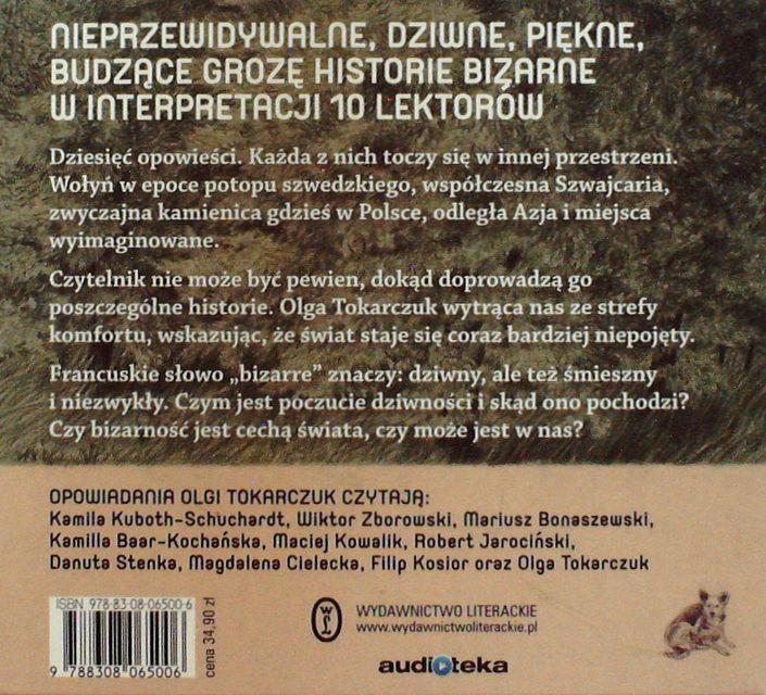 Opowiadania bizarne / Olga Tokarczuk. - Kraków : Wydawnictwo Literackie ; [Warszawa] : Audioteka, 2018. - 1 płyta audio CD (6 godz. 43 min) : digital, stereo ; 12 cm.