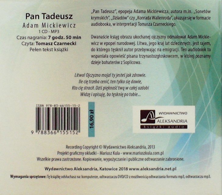 Pan Tadeusz / Adam Mickiewicz ; czyta Tomasz Czarnecki. - Katowice : Wydawnictwo Aleksandria, 2018. - 1 płyta audio CD (7 godz. 50 min) : digital, stereo ; 12 cm.