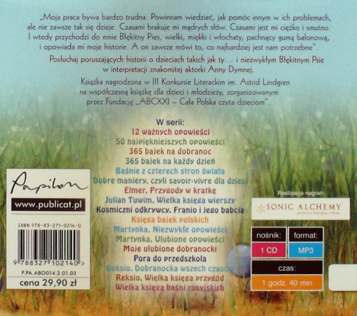 Opowieść o Błękitnym Psie : czyli O rzeczach trudnych dla dzieci / Beata Majchrzak ; czyta Anna Dymna. - Poznań : Publicat S.A., 2018. - 1 płyta CD (1 godz. 40 min) : zapis cyfrowy, stereo. ; 12 cm.