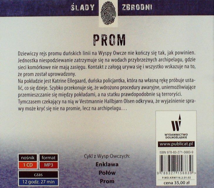 Prom / Remigiusz Mróz pod pseudonimem Ove Logmansbo ; czyta Marek Kalita. - Poznań ; Wrocław : Wydawnictwo Dolnośląskie - grupa wydawnicza Publicat S.A., 2017. - 1 płyta audio (CD) (12 godz. 27 min) : zapis cyfrowy, stereo. ; 12 cm.