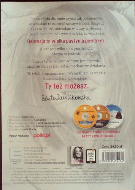 Wyszłam z niemocy i depresji ty też możesz / Beata Pawlikowska. - Warszawa : Edipresse Polska SA, 2016. - 1 płyta audio (CD) (6 godz. 50 min) : zapis cyfrowy, stereo. ; 12 cm.