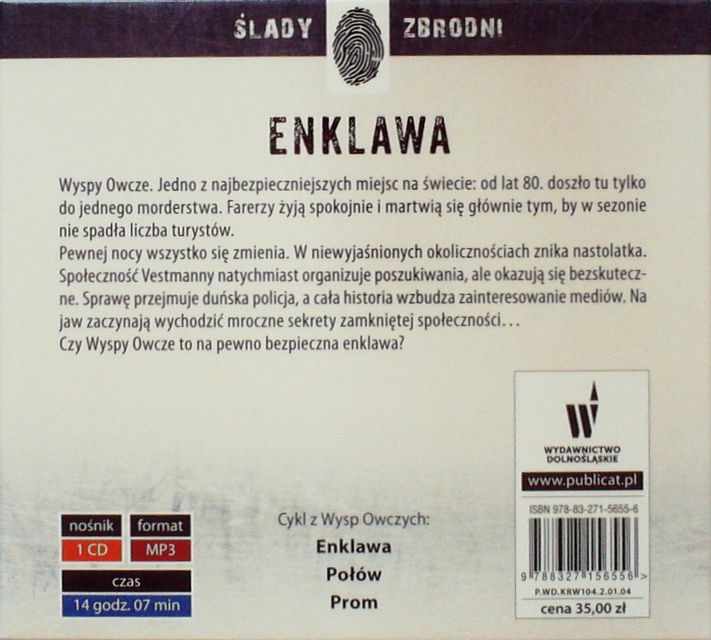 Enklawa / Remigiusz Mróz pod pseudonimem Ove Logmansbo ; czyta Marek Kalita. - Poznań ; Wrocław : Wydawnictwo Dolnośląskie - grupa wydawnicza Publicat S.A., 2017. - 1 płyta audio (CD) (14 godz. 07 min) : zapis cyfrowy, stereo. ; 12 cm.