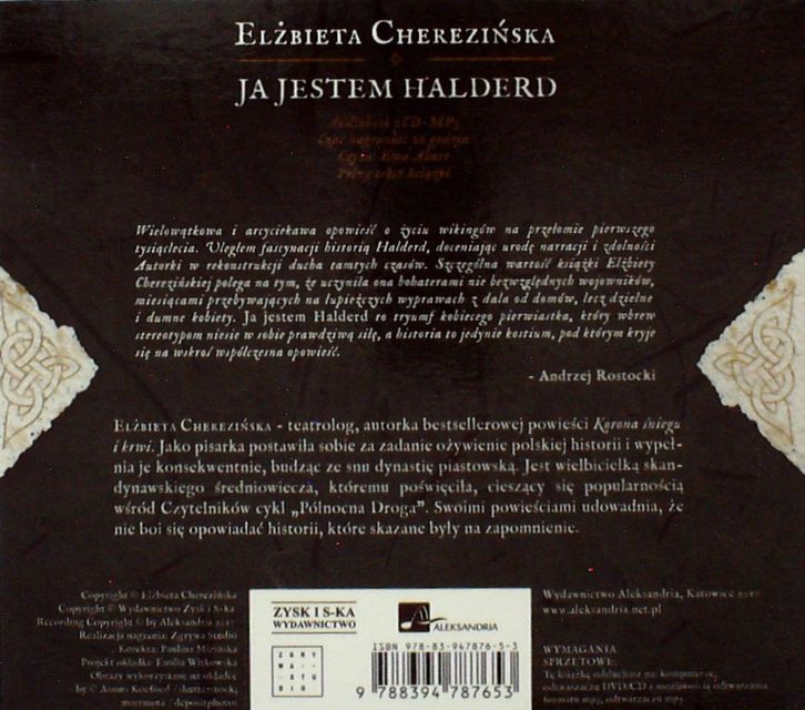 Ja jestem Halderd / Elżbieta Cherezińska ; czyta Ewa Abart. - Katowice : Wydawnictwo Aleksandria ; [Poznań] : Zysk i S-ka Wydawnictwo, 2017. - 1 płyta audio CD (16 godz.) : zapis cyfrowy, stereo. ; 12 cm.