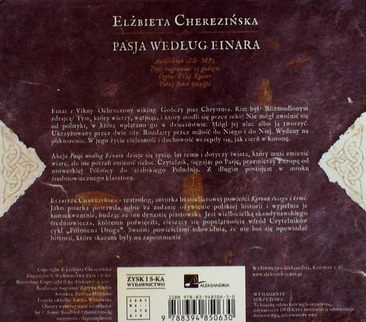 Pasja według Einara / Elżbieta Cherezińska ; czyta Filip Kosior. - Katowice : Wydawnictwo Aleksandria ; [Poznań] : Zysk i S-ka Wydawnictwo, 2017. - 1 płyta audio CD (13 godz.) : zapis cyfrowy, stereo. ; 12 cm.