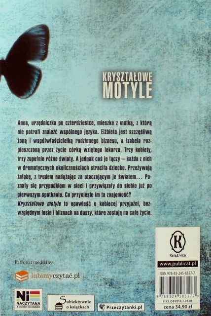 Historia zaczyna się od mocnego uderzenia w czytelnika przytłaczającym wydarzeniem, tylko po to aby zakończeniu doprowadzić go do łez. Jest to książka, którą całkowicie inaczej sobie wyobrażałam i szczerze mówiąc jestem bardzo pozytywnie zaskoczona. (...) Pomimo tego że fabuła jest dość pesymistyczna i zdecydowanie nie nadaje się jako lektura rozluźniająca, to ma w sobie coś, co sprawia, że zaczynamy myśleć nad własnym życiem i próbujemy chociaż w najmniejszym stopniu zrozumieć dlaczego kobiety zachowywały się tak a nie inaczej. W tej powieści poznajemy trzy główne bohaterki. Są to Iza, Anna i Ela. Każda prowadzi inne życie jednak mają jeden wspólny mianownik. Nagła śmierć dziecka. Izabela próbuje żyć, próbuje to słowo klucz, bo tak na prawdę nie pogodziła się z wypadkiem jaki przydarzył się jej córeczce. Rozeszła się z mężem, ma do niego żal, że jego córka z poprzedniego małżeństwa żyje, a ona jest samotna. Z każda chwilą, w której ją poznajemy staje się coraz bardziej zgorzkniała i zatracona we własnym smutku. Anna to kobieta, która zawsze żyła pod dyktando własnej matki i siostry. Samotnie wychowywała zbuntowaną nastolatkę, którą zniszczyła anoreksja. Problemy rodzinne i ciągłe psychiczne obciążenie sprawiają, że chce w swoim życiu coś zmienić, natomiast Elżbieta ma dom, firmę, kochającego męża i córkę. Śmierć syna sprawiła, że to wszystko przestało mieć znaczenie. Pogrążona w alkoholu musi wreszcie zrozumieć, że ma dla kogo żyć, czego dowodem będzie zachowanie córki. To zestawienie trzech różnych osobowości, jednak na tle jednego wydarzenia możemy zobaczyć, że tak naprawdę w obliczu tragedii nikt z nas nie potrafi być na tyle silnym, aby zmierzyć się z nią w samotności. To jedna z trudniejszych w odbiorze książek. Porusza ważne, wzruszające i bolesne tematy, a postać Izabeli choć dla niektórych może się wydawać straszna, to dla mnie okazuje się być symbolem całej tej historii. Postać tragiczna, przedstawiona jako samotna, porzucona i zdesperowana. Jak każda matka, która straciła swoje dziecko i choć stała się taka na własne życzenie, nie miała nikogo kto mógłby jej pomóc. "Kryształowe motyle" to pełna metafor historia o utracie dziecka, ale i tworzeniu nowego życia. O odrodzeniu się z popiołów na tyle, aby móc funkcjonować i żyć pełną piersią, a nie wegetować przez następne lata. Wzruszająca i pełna smutku, ale jednocześnie pokazuje nam, że nic nie dzieje się przypadkiem.