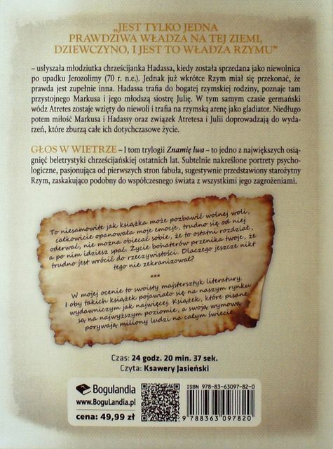 Głos w wietrze / Francine Rivers ; czyta Ksawery Jasieński. - [Łomianki] : Wydawnictwo Bogulandia, 2019. - 2 płyty audio CD-MP3 (24 godz. 20 min 37 s) : zapis cyfrowy, stereo. ; 12 cm.