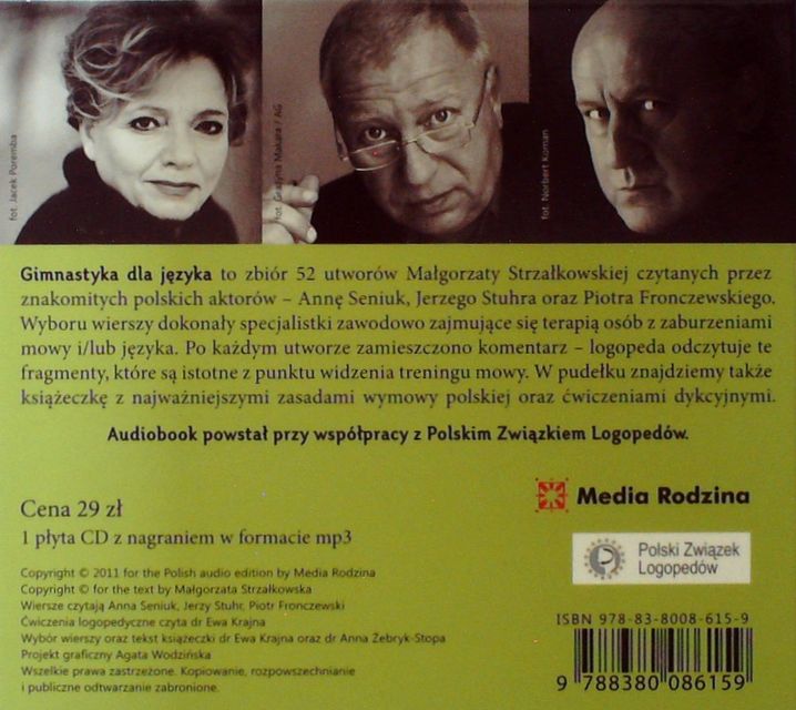 Wiersze czytają: Anna Seniuk, Jerzy Stuhr, Piotr Fronczewski, ćwiczenia logopedyczne czyta Ewa Krajna oraz Anna Żebryk-Stopa.