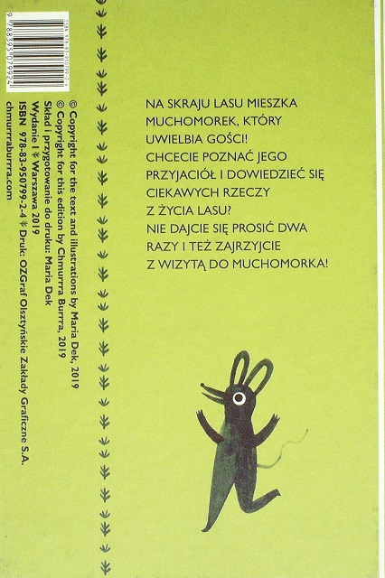 Kto odwiedził Muchomorka / Maria Dek. - Warszawa : CHMURRRA BURRRA, 2019. - [28] stron : ilustracje kolorowe ; 25 cm.