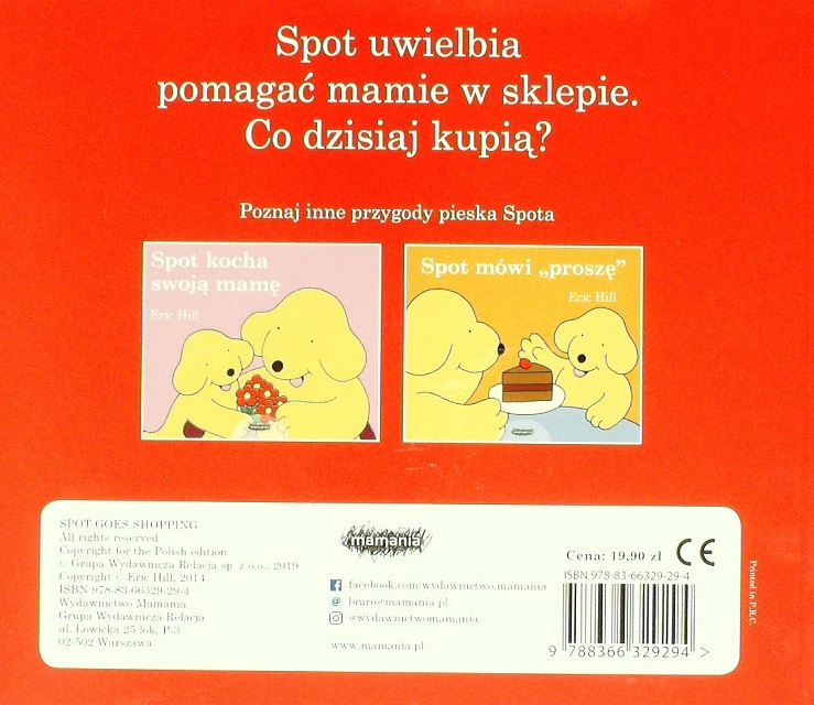 Spot idzie na zakupy / Eric Hill. - Warszawa : Wydawnictwo Mamania Grupa Wydawnicza Relacja, 2019. - [12] stron : ilustracje kolorowe ; 16 x 19 cm.