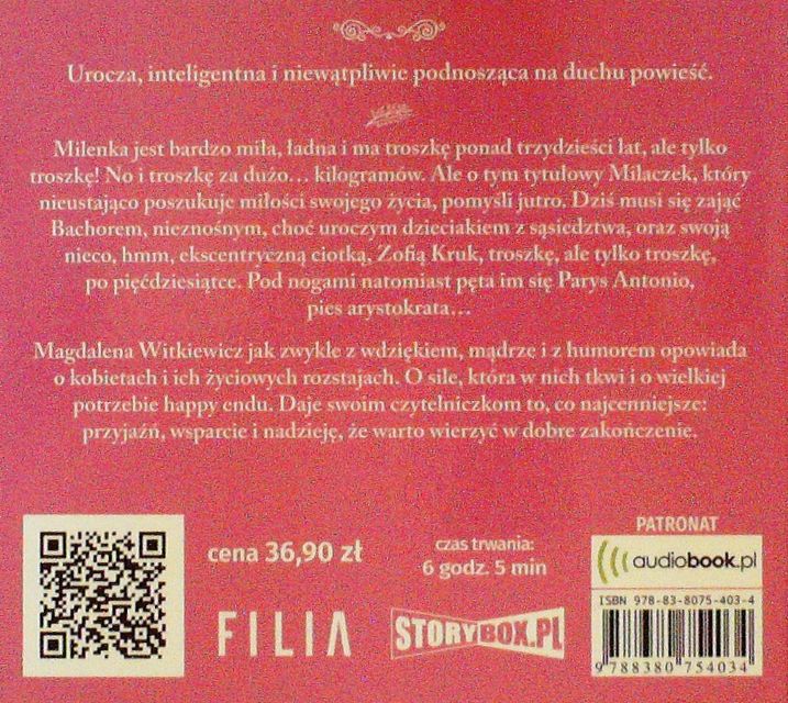 Milaczek / Magdalena Witkiewicz ; czyta Magda Karel. - Poznań : Wydawnictwo Filia ; Piaseczno : Heraclon International - Storybox.pl, 2019. - 1 płyta audio CD (6 godz. 5 min) : zapis cyfrowy, stereo ; 12 cm.