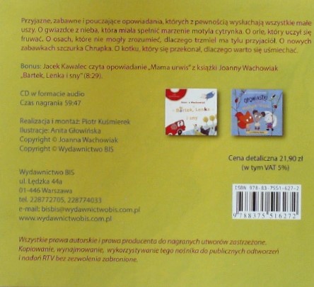 Historyjki dla małych uszu / Joanna Wachowiak ; czyta Elżbieta Pejko. - Warszawa : Wydawnictwo bis, [2020]. - 1 płyta audio CD (59 min 47 sek) : digital, stereo ; 12 cm.