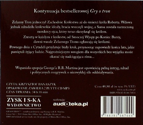 Starcie Królów / George R.R. Martin ; czyta Krzysztof Banaszyk. - Poznań : Zysk i S-ka Wydawnictwo, 2013. - 2 płyty CD-MP3 (34 godz. 18 min.) : zapis cyfrowy, stereo ; 12 cm.