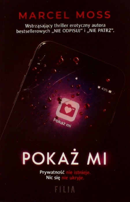 Autor: Marcel Moss Tytuł: Pokaż mi Wydawnictwo: Filia Liczba stron: 382 Łukasz ma z pozoru wszystko – kochającą narzeczoną, stabilny związek, dobrą pracę. To mu jednak nie wystarcza. Gdy zaczynają się pojawiać problemy, przyjaciel namawia Łukasza do zainstalowania aplikacji randkowej Pokaż mi, w której może flirtować z Królową i oderwać się od trosk. Na początku mężczyzna podchodzi do tej zabawy sceptycznie, jest ostrożny,