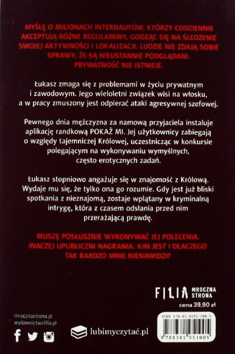 Pojawiają się w powieści również tematy stalkingu i szantażu. Nie są one nazwane wprost, szczególnie ten pierwszy, jednak trzeba przyznać, że podczas lektury właśnie te dwie rzeczy uderzają czytelnika. Nigdy nie wiemy, kto jest po drugiej stronie ekranu, dlatego należy być ostrożnym. I taki na początku był też główny bohater. Z czasem jednak Łukasz pozwalał sobie na więcej, zaangażował się, zaufał poznanej w sieci osobie, której nie widział i o której nic nie wiedział. Dał się ponieść emocjom i właśnie to wykorzystała Królowa. Poznała jego sekrety i mogła żądać od mężczyzny wykonywania coraz śmielszych zadań, wiedząc, że musi się on zgodzić, bo inaczej może wiele stracić.