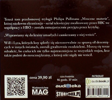 Bursztynowa luneta / Philip Pullman ; przekład Wojciech Szypuła ; czyta Filip Kosior. - [Warszawa] : Wydawnictwo MAG, 2019. - 1 CD (16 godz. 37 min) : zapis cyfrowy, stereo ; 12 cm.