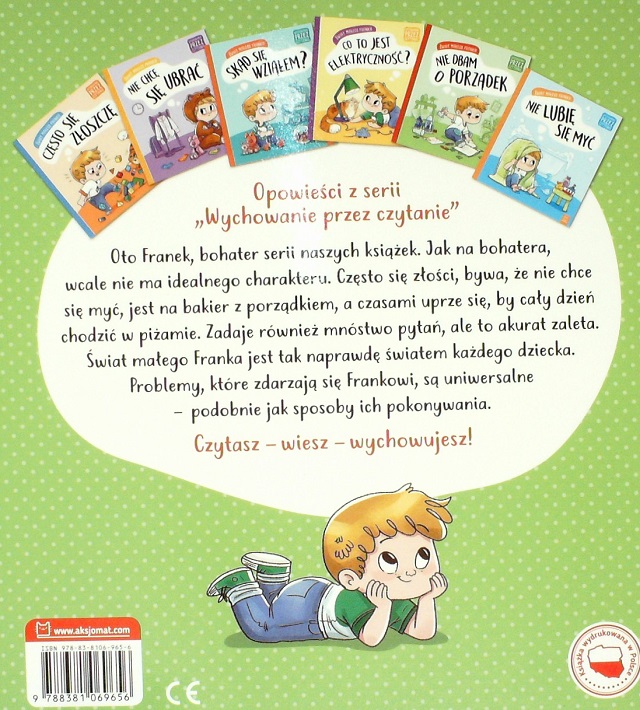 Oto Franek, bohater serii naszych książek. Jak na bohatera, wcale nie ma idealnego charakteru. Często się złości, bywa, że nie chce się myć, jest na bakier z porządkiem, a czasami uprze się, by cały dzień chodzić w piżamie. Zadaje również mnóstwo pytań, ale to akurat zaleta. Świat małego Franka jest tak naprawdę światem każdego dziecka. Problemy, które zdarzają się Frankowi, są uniwersalne - podobnie jak sposoby ich pokonywania. Czytasz - wiesz - wychowujesz! [nota wydawcy]