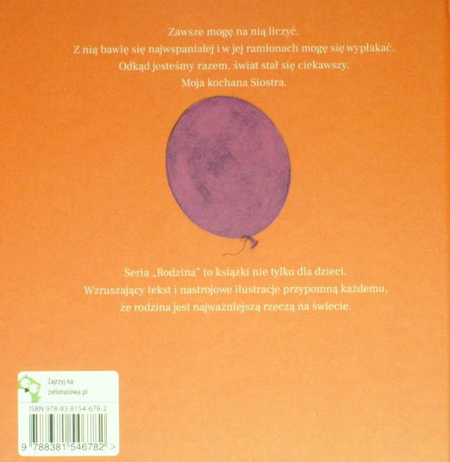 Siostra / Barbara Supeł ; ilustrowała Sara Olszewska. - Warszawa : Wydawnictwo Zielona Sowa, 2020. - [24] strony : ilustracje kolorowe ; 20 x 20 cm.