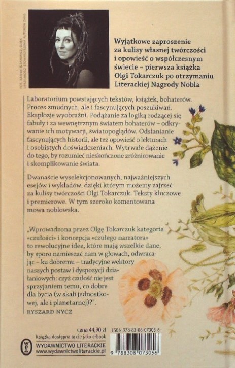 Książkę powinni przeczytać wszyscy tworzący literaturę, ale przeznaczona jest również dla zwykłego czytelnika. Ważne tylko, żeby kochał książki, wtedy z łatwością pojmie pojęcie czułego narratora. Literatura dla Tokarczuk to bardzo wyrafinowany i szczególny sposób komunikacji międzyludzkiej, precyzyjny i zarazem totalny. Osobny esej poświęca też pisarka tłumaczom, których pracę porównuje do działań starożytnego boga Hermesa, ceniąc ich pośrednictwo, ocalanie dzieł przed zniszczeniem i zniknięciem, zaszczepianie nowych prądów, uwspółcześnianie języka. Tokarczuk wspomina swoje czytelnicze dzieciństwo pełne książek, ujawnia ulubione lektury, przywołuje we wspomnieniach ojca bibliotekarza. Najniezwyklejszą częścią tej książki są jednak rozważania narracyjne. Olga Tokarczuk przygląda się sobie i swojemu pisaniu z pozycji czwartoosobowego narratora. Te przemyślenia związane są z psychologią, przez którą noblistka ciągle odczytuje świat. Niezwykle inspirujące uniwersyteckie studia psychologiczne podsunęły jej wiedzę, która ukształtowała w niej na zawsze wiele z literackich języków, jakimi posługuje się w swojej prozie. Dlaczego akt tworzenia jest niezwykły, irracjonalny, magiczny? Jakie były inspiracje niektórych powieści i w jaki sposób pojawił się pomysł na ich napisanie? Dlaczego bohater żyje poza powieścią? Na te i inne pytania znajdą Państwo odpowiedź w tej książce, opublikowanej przez Wydawnictwo Literackie i będącej zbiorem dwunastu tekstów pozwalających lepiej zrozumieć nie tylko twórczość Olgi Tokarczuk, ale i literaturę.