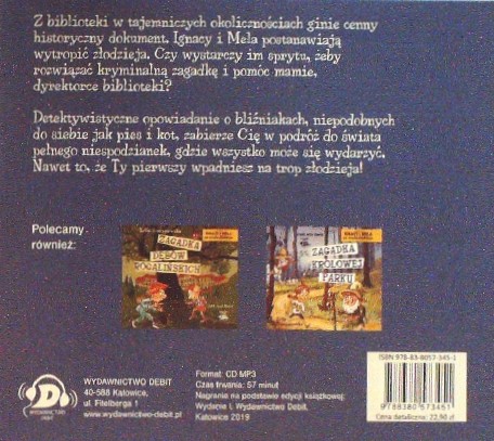 Zagadka Biblioteki / Zofia Staniszewska ; czyta Artur Barciś. - Katowice : Wydawnictwo Debit, 2019. - 1 płyta audio CD (57 min.) : zapis cyfrowy, stereo ; 12 cm.