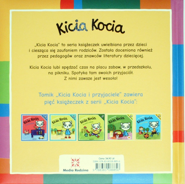 TOMIK ''KICIA KOCIA I PRZYJACIELE'' ZAWIERA PIĘĆ KSIĄŻEK Z SERII ''KICIA KOCIA'' PT: ''KICIA KOCIA W PRZEDSZKOLU'' ; KICIA KOCIA NIE CHCE SIĘ BAWIĆ'' ; KICIA KOCIA NA PLACU ZABAW'' ; KICIA KOCIA NA PIKNIKU'' ; KICIA KOCIA GRA W PIŁKĘ''.