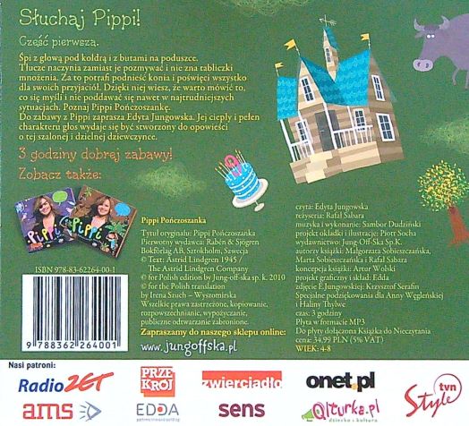 Pippi Pończoszanka / Astrid Lindgren ; tłumaczenie Teresa Chłapowska ; czyta Edyta Jungowska. - Warszawa : Jung-off-ska, 2010. - 1 płyta audio CD (3 godz.) : digital, stereo ; 12 cm + książeczka [23] strony.