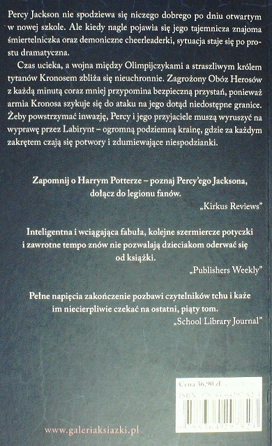 Jest to niesamowity 4 tom fantastycznej serii o Percym. By uratować obóz syn Posejdona rusza na wyprawę do wielkiego labiryntu. Zostaje tam wiele niebezpiecznych przygód. Warto przeczytać całą serię po kolej gdyż jest to niesamowita historia dożąca do jednego...