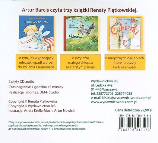 Cukierki ; Lemoniadowy ząb ; Dziadek na huśtawce / Renata Piątkowska ; czyta Artur Barciś. - Warszawa : Wydawnictwo bis, [2021]. - 2 płyty audio (CD) (1 godz. 43 min) : zapis cyfrowy, stereo ; 12 cm.