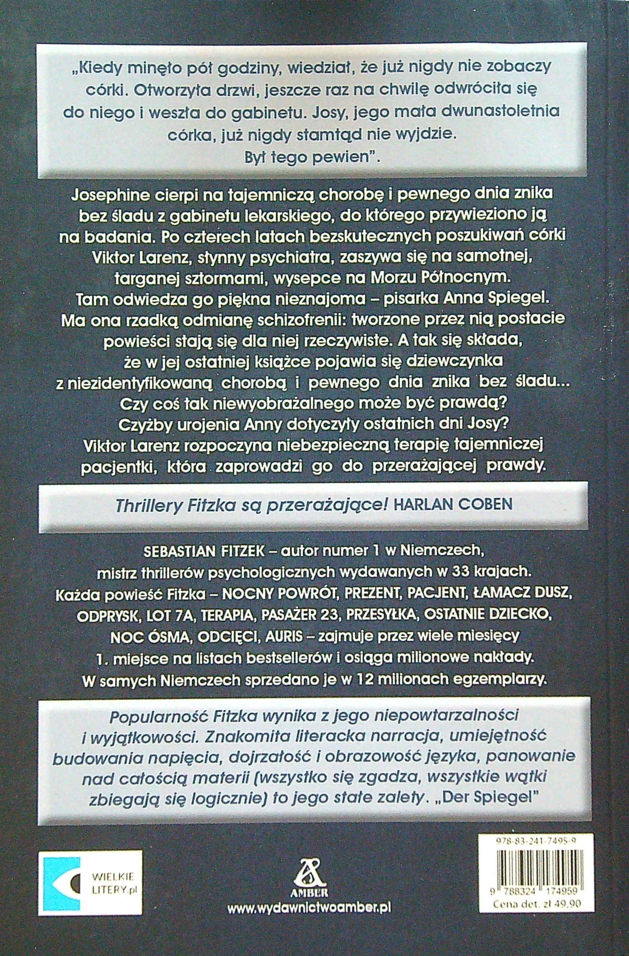Terapia / Sebastian Fitzek ; przekład Barbara Tarnas. - Wydanie IV. - Warszawa : Wydawnictwo Amber Sp. z o.o., 2021. - 311, [1] strona ; 24 cm.