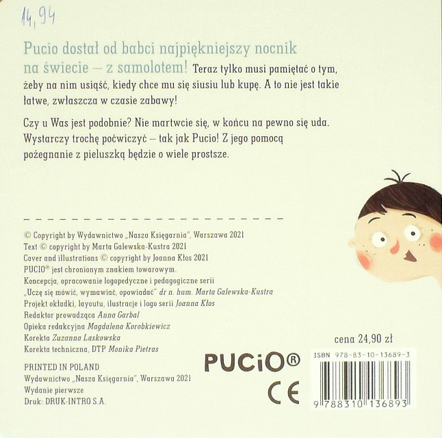 Pucio chce siusiu, czyli pożegnanie pieluszki / Marta Galewska-Kustra ; ilustracje Joanna Kłos. - Wydanie pierwsze. - Warszawa : Wydawnictwo Nasza Księgarnia, 2021. - [28] stron : ilustracje kolorowe ; 14 x 14 cm.