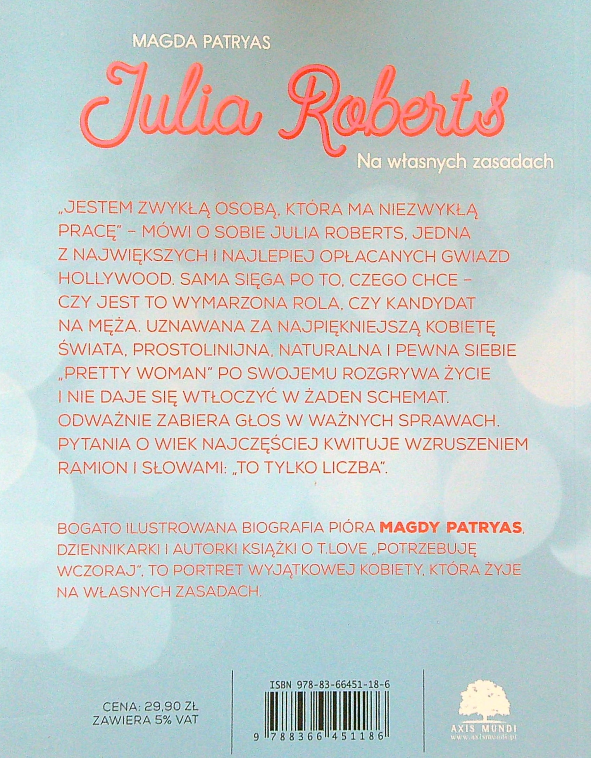 Julia Roberts : Na własnych zasadach / Magda Patryas. - Warszawa : Axis Mundi, 2021. - 189, [3] strony : ilustracje ; 21 cm.