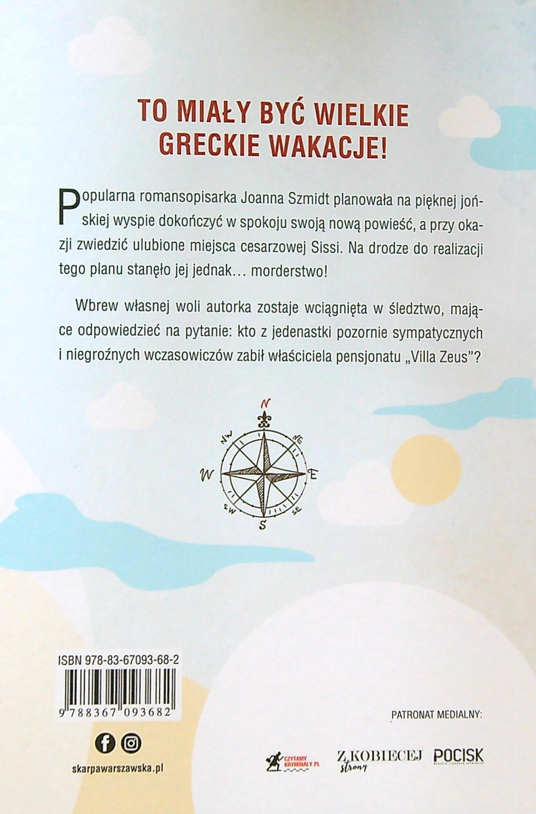 Joanna, popularna romansopisarka, wyrusza na wielkie greckie wakacje, podczas których zamierza w spokoju skończyć pracę nad swoją nową książką. Niestety, spokój to ostatnie, co jest jej dane. Już pierwszego dnia autorka staje się świadkiem morderstwa. Szybko okazuje się, że mógł je popełnić tylko ktoś, kto wraz z nią zamieszkał w niewielkim pensjonacie, znajdującym się na pięknej wyspie Korfu. Kto z jedenastki na pozór sympatycznych urlopowiczów okaże się bezwzględnym zabójcą? opis pochodzi z okładki książki W książce ukazane są Greckie realia, mianowicie: wszystko się spóźnia. Autor był w tym kraju, dlatego serwuje nam opisy różnych budynków, co daje tej książce nutę wiarygodności. Na pewno muszę tam pojechać Joanna – popularna pisarka, którą głównie czytają starsze panie. Ciekawska, kontrowersyjna, z dużym poczuciem humoru, szczera postać, bez której byłoby nudno. Lubi się ją od początku poznania. Betty – menedżerka Joanny, równie śmieszna i sympatyczna. Jej chlebodawczyni często krytykuje jej styl ubierania się, gdyż nosi ona głównie czarne ciuchy. Bez niej Joanna nie dałaby sobie rady – nie tylko w kwestii rozwiązywania zagadek kryminalnych, chociaż... Magda – bohaterka, którą nie polubiłem. Dlaczego? Uno: obraziła mój ukochany gatunek muzyczny, mianowicie metal. Due: jest egoistyczna, prymitywna i w ogóle... Ugh!