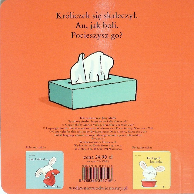 Nie płacz króliczku / [tekst i ilustracje] Jorg Muhle. - Wydanie I. - Warszawa : Wydawnictwo Dwie Siostry, 2018. - [22] strony : ilustracje ; 17x17 cm.
