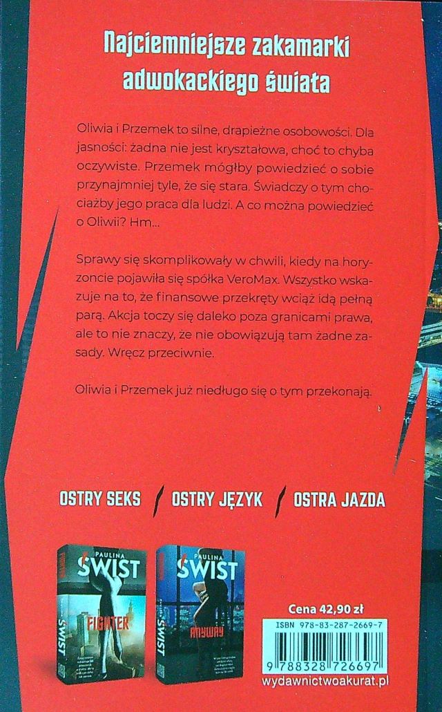 Tym razem to 3 część serii: cz. 1 Fighter cz. 2 Anyway Bohaterami są Przemek i Oliwia, ich związek rozpadł się 2 lata temu gdy ona powiedziała, że go kocha. Przemek jak twierdzi nie nadawał się do związku. (...) To była kiepska wymówka bo przed nim była organizacja akcji życia. Polecam jak wszystkie książki tej autorki - Pani mecenas.