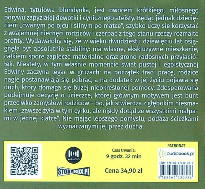 Blondynka moralnego niepokoju. Komedia drogi / Danuta Noszczyńska ; czyta Ewa Abart. - Piaseczno : Xaudio Sp. z o.o. ; Piaseczno : Heraclon International - Storybox.pl, 2021. - 1 płyta audio (CD) (9 godz. 32 min) : zapis cyfrowy, stereo. ; 12 cm.