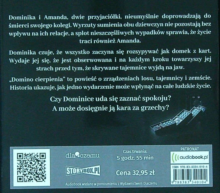 Domino cierpienia / Patrycja Arendt ; czyta Joanna Domańska. - Warszawa : Wydawnictwo Dlaczemu ; Piaseczno : Heraclon International - Storybox.pl, 2022. - 1 płyta audio (CD) (5 godz. 55 min): zapis cyfrowy, stereo. ; 12 cm.