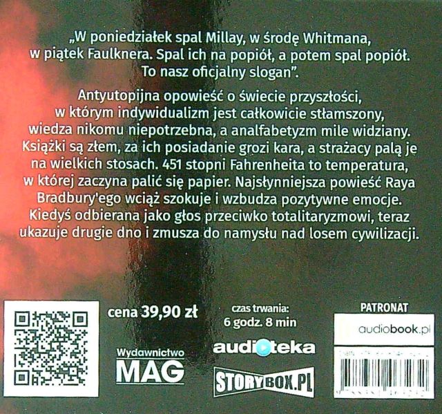 451˚ Fahrenheita / Ray Bradbury ; przekład Wojciech Szypuła. - Piaseczno : Heraclon International - Storybox.pl, 2018. - 1 płyta audio (CD-MP3) (6 godz. 8 min) : zapis cyfrowy, stereo ; 12 cm.
