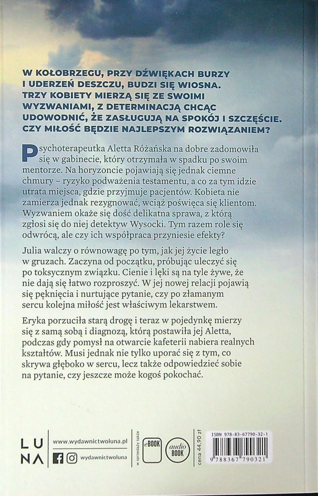 @dorota_milli zabiera nas do urokliwego Kołobrzegu, gdzie dzięki losom trzech kobiet, ukazuje życiowe zawirowania. Mimo że różnią się charakterem, mają inne spojrzenie na życie, to jednak nawiązała się między nimi nić przyjaźni, która z każdym spotkaniem się zacieśnia, sprawiając że są dla siebie prawdziwym wsparciem. Polubiłam bohaterki jak również bohaterów tej powieści. Czekam na dalszy rozwój wydarzeń, bo podejrzewam że autorka jeszcze nas zaskoczy ich losami ...a miłość czuć w powietrzu.