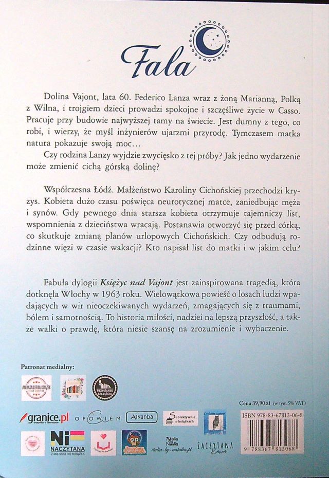 Księżyc nad Vajont. T.1, Fala / Katarzyna Kielecka. - Katowice : Wydawnictwo Szara Godzina s.c., 2023. - 275, [3] strony : mapy ; 21 cm.