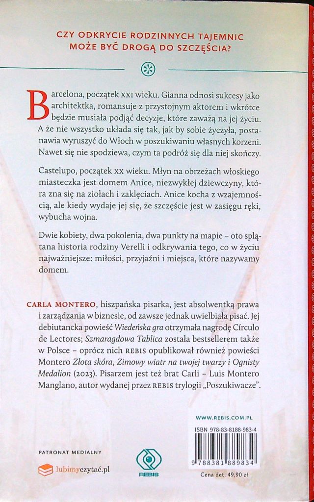 Dla książek Carli bardzo charakterystyczne są dość pogmatwane relacje rodzinne. Podczas czytania należy trochę się skupić w kwestii wszelkich imion, nazwisk i stopni pokrewieństwo. Inaczej będziemy zmuszeni zawsze cofać się o kilka stron, by rozwiać swoje wątpliwości. Jednak warto przebrnąć przez podobne „niedogodności”, bo osobiście szybko zaczęłam rozumieć akcję. Dlatego — nie zniechęcajmy się! Istotnie, jestem pewna, iż fani romantycznych, lecz nie przesłodzonych fabuł zakochają się w twórczości Montero. Jej największa zaleta to właśnie brak popadania w banały, utarte schematy.