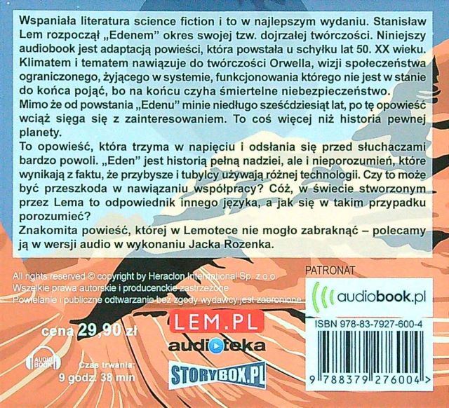 Tytuł: „Eden” Autor: Stanisław Lem Wydawnictwo: Literackie Projekt okładki: Przemek Dębowski Opieka redakcyjna: Krystyna Zaleska Wydanie: II Oprawa: miękka (ze skrzydełkami) Liczba stron: 414 Data wydania: 23.06.2016 ISBN: 978-83-08-06174-9 Źródło – Lubimy Czytać