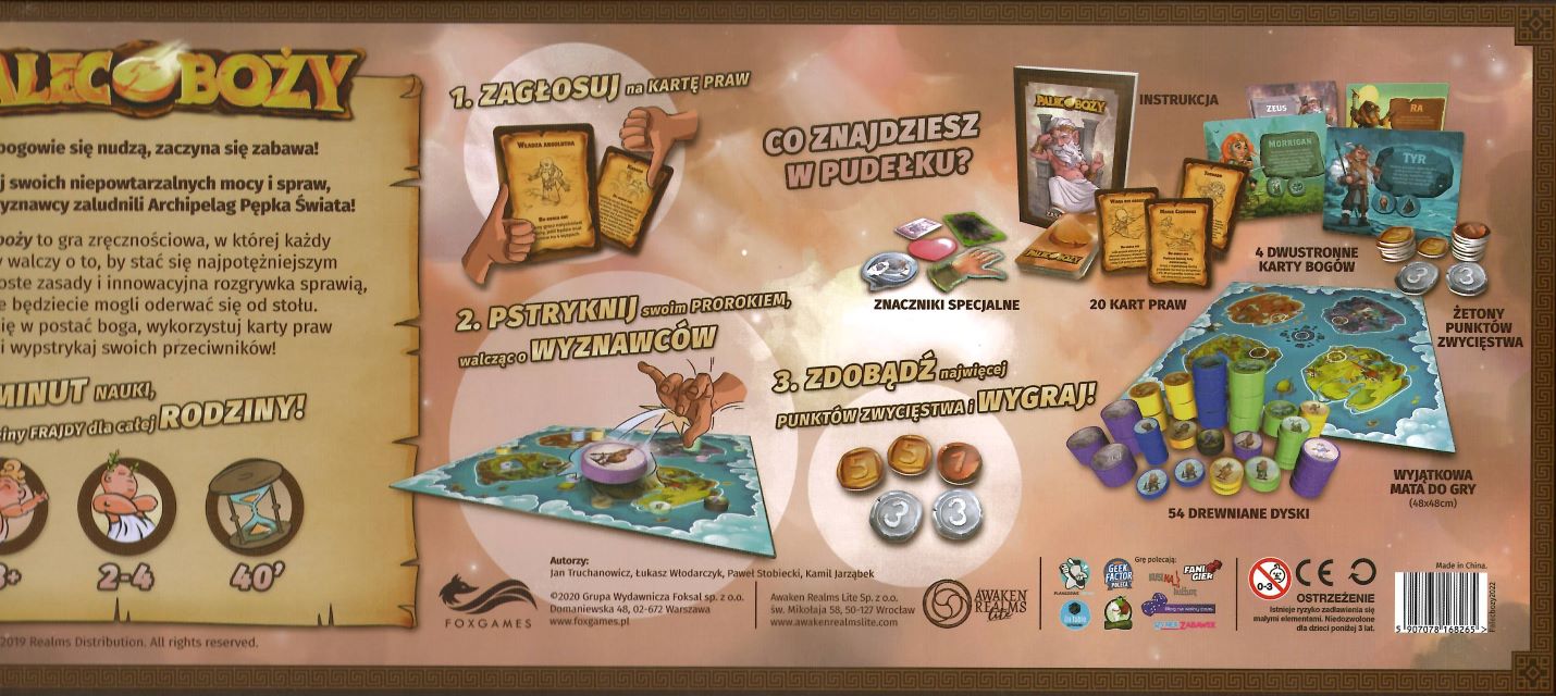 Palec boży / Jan Truchanowicz, Łukasz Włodarczyk, Paweł Stobiecki, Kamil Jarząbek. - Warszawa : Grupa Wydawnicza Foksal, 2020. - 1 gra (mapa do gry, 4 dwustronne karty bogów, 20 kart praw, 28 dysków proroków, 8 dysków templariuszy, 16 dysków świątyń, 1 dysk króla małp, 1 dysk sfinksa, 1 znacznik pierwszego gracza, 1 znacznik ręki boga, żetony punktów zwycięstwa, 1 płytka rezerwy, 1 znacznik serca, 1 znacznik tornada) : karton, tektura, drewno, bawełna, kolor ; w pudełku 20x50x9 cm + instrukcja (12 stron : ilustracje kolorowe ; 19 cm).
