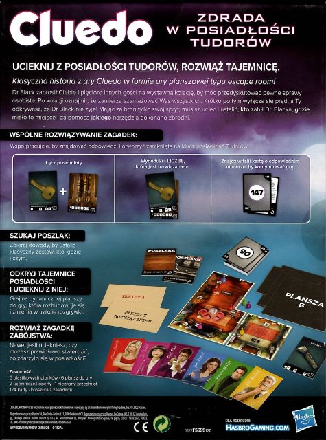 Cluedo : zdrada w posiadłości Tudorów. - Warszawa : Hasbro, 2022. - 1 gra (6 plastikowych pionków, 6 plansz do gry, 2 tajemnicze koperty, 1 nieznany przedmiot, 124 karty) : plastik, karton, tektura, kolor ; w pudełku 6x20x27 cm + instrukcja (14 stron : ilustracje ; 21 cm).