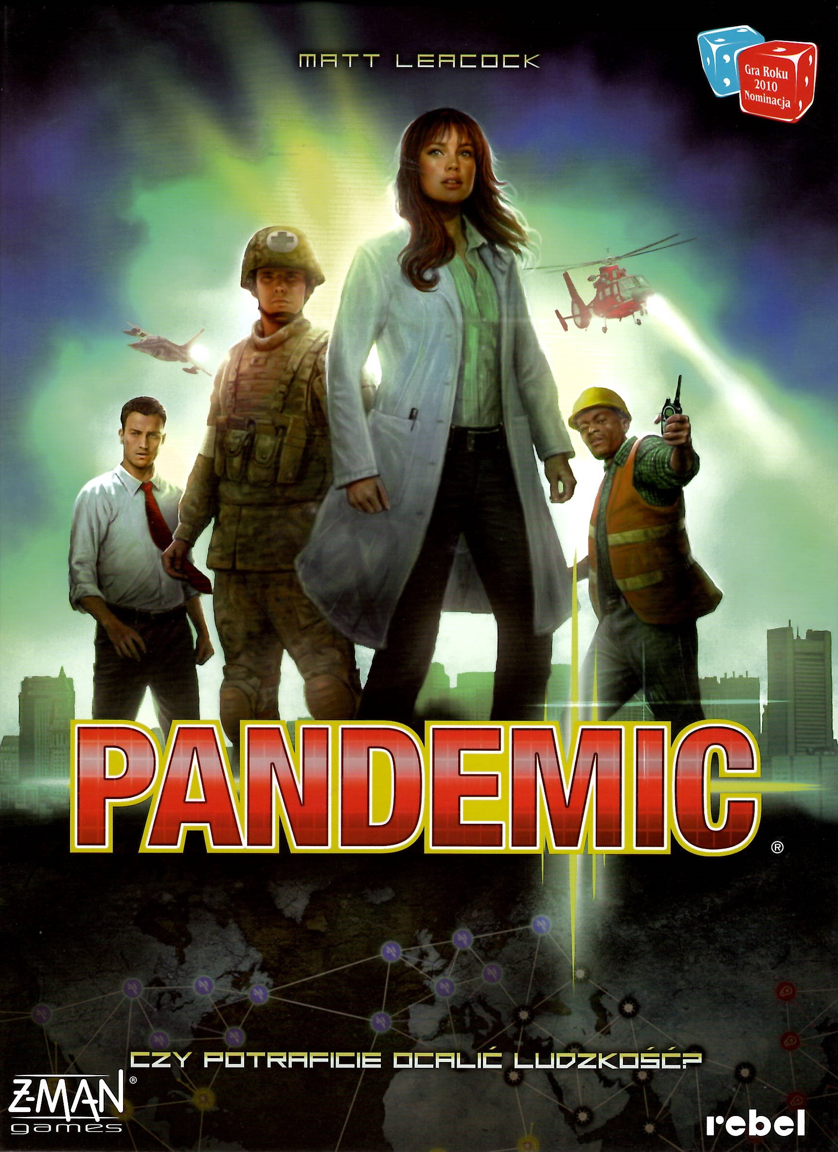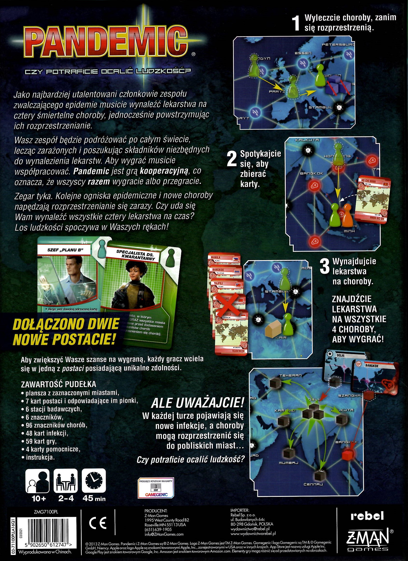 Pandemic : czy potraficie ocalić ludzkość? / projekt gry Matt Leacock ; grafika Chris Quilliams ; tłumaczenie Przemysław Korzeniewski. - Gdańsk : Rebel, [2020]. - 1 gra (plansza, 7 kart postaci, 7 pionków graczy, 6 stacji badawczych, 4 znaczniki lekarstw, 96 znaczników chorób, 48 kart infekcji, 59 kart gry, 4 karty pomocnicze, znacznik rozprzestrzeniania się chorób, znacznik poziomu zachorowań) ; karton, kolor ; w pudełku 30x22x4 cm + instrukcja (8 stron : ilustracje ; 30 cm).