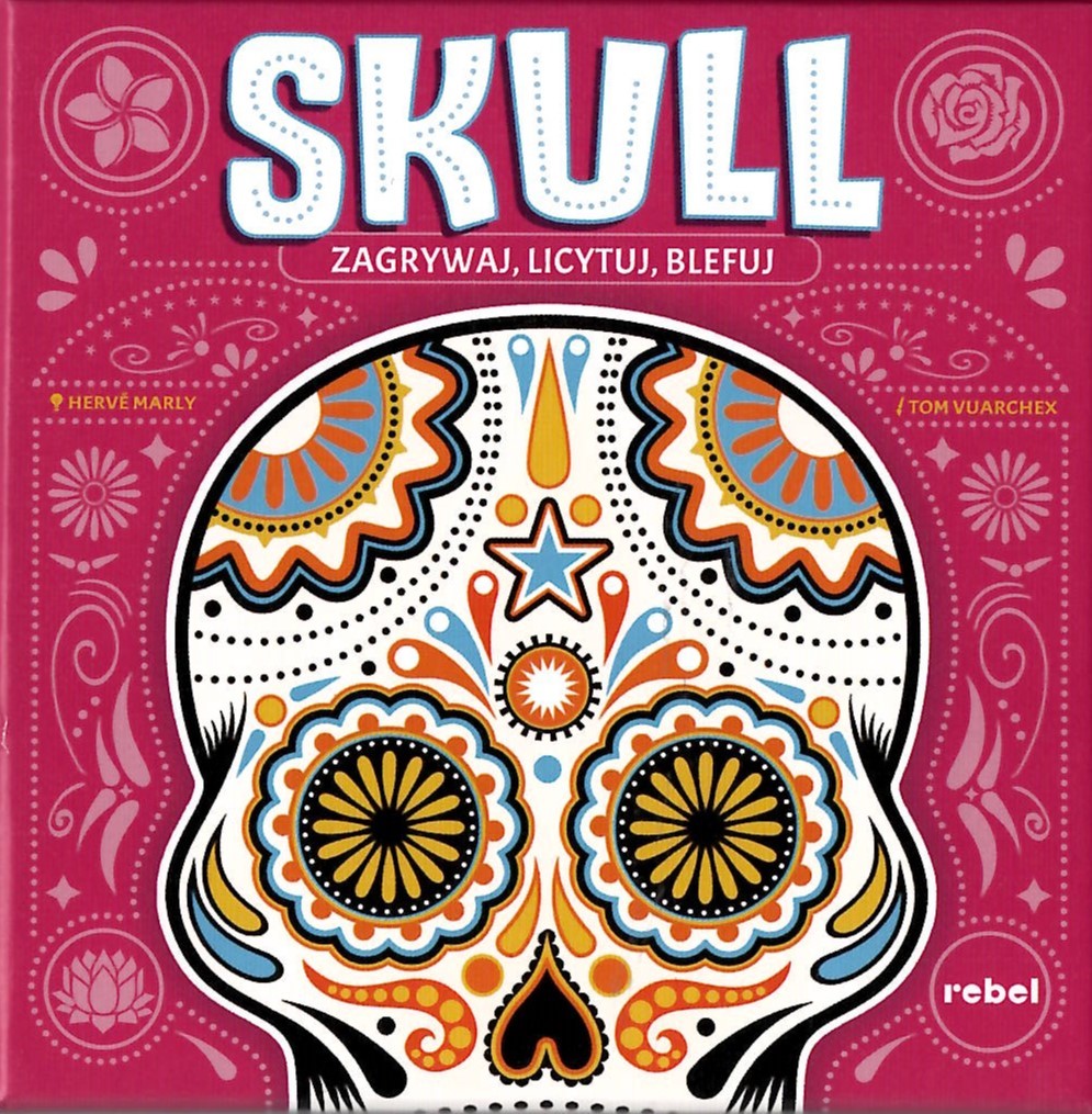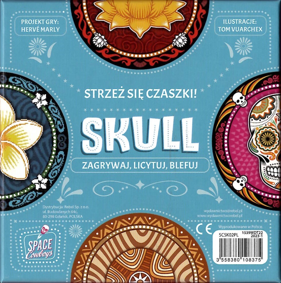 Skull / projekt gry Herve Marly ; ilustracje Tom Vuarchex. - Warszawa : Rebel, 2023. - 1 gra (6 podkładek, 6 zestawów po 4 żetony, żeton ostatniej szansy) : tektura, karton, kolor ; w pudełku 14x14x5 cm + instrukcja (8 stron : ilustracje ; 12 cm).