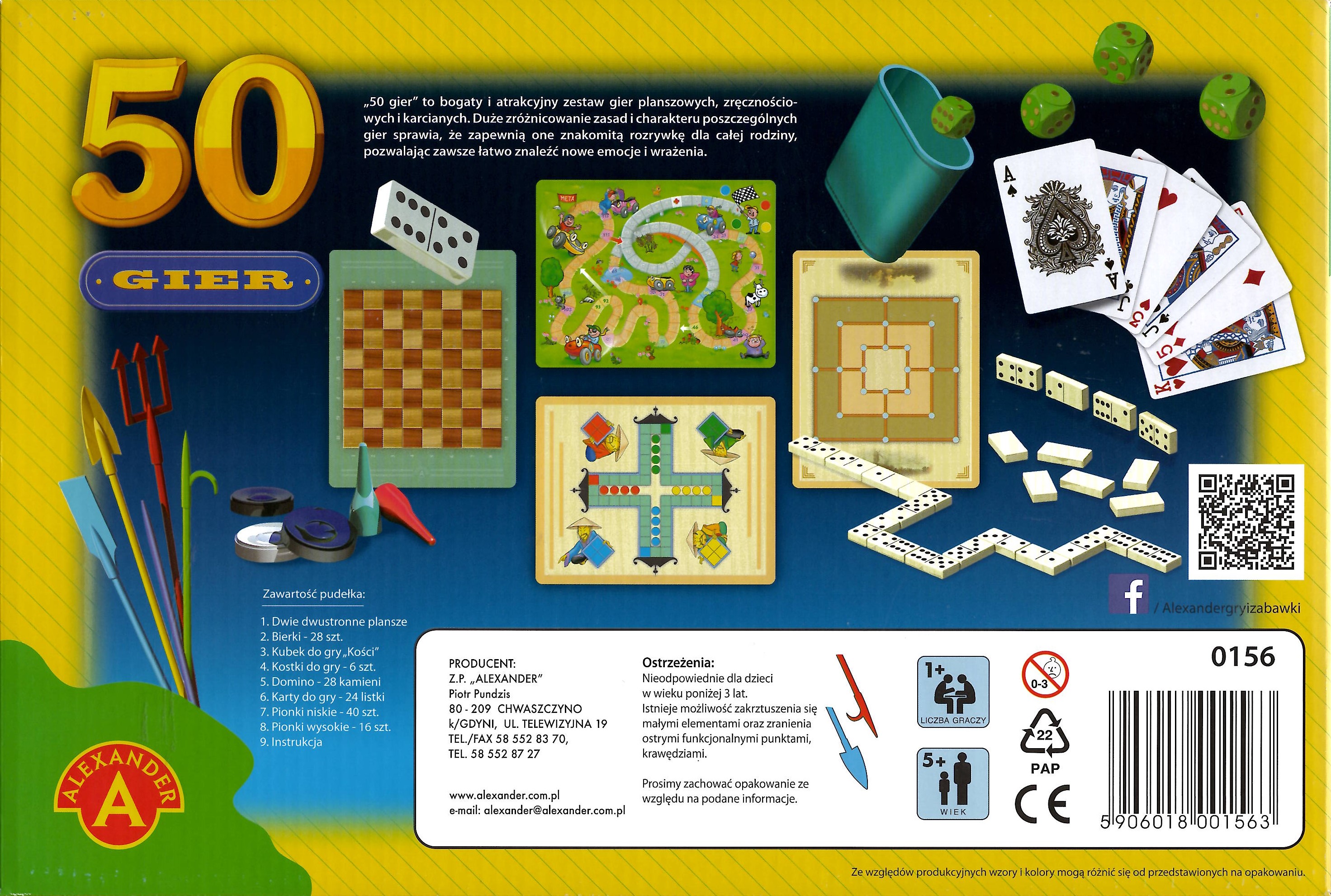 50 gier. - Chwaszczyno : Alexander, 2019. - 1 gra (2 dwustronne plansze, 28 bierek, kubek do gry w kości, 6 kostek do gry, 28 kamieni domina, 24 karty do gry, 40 pionków niskich, 16 pionków wysokich) : karton, plastik, papier, kolor ; w pudełku 38x26x6 cm + instrukcja (32 strony : ilustracje ; 21 cm)