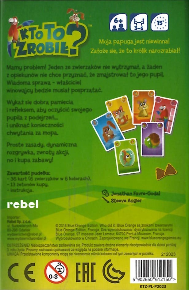 Kto to zrobił? / Jonathan Favre-Godal ; ilustracje Steeve Augier ; przekład Rafał Kalota. - Gdańsk : Rebel, 2018. - 1 gra (36 kart, 13 żetonów kupy) : karton ; w pudełku 12x8x4 cm + instrukcja ( 8 stron : ilustracje ; 10 cm).