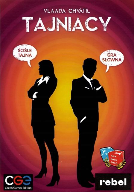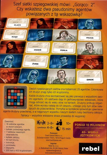Tajniacy / Vlaada Chvatil ; ilustracje Tomas Kucerovsky ; projekt graficzny Filip Murmak ; tłumaczenie Martyna Skowron. - Gdańsk : Rebel, 2015. - 1 gra (16 kafelków agentów, kafelek podwójnego agenta, 7 kafelków niewinnych obserwatorów, 1 kafelek zabójcy, 40 kart kluczy, podstawka, klepsydra, 200 kart z 400 kryptonimami) : karton, papier, plastik ; w pudełku 5x16x23 cm + instrukcja (8 stron : ilustracje ; 21cm).