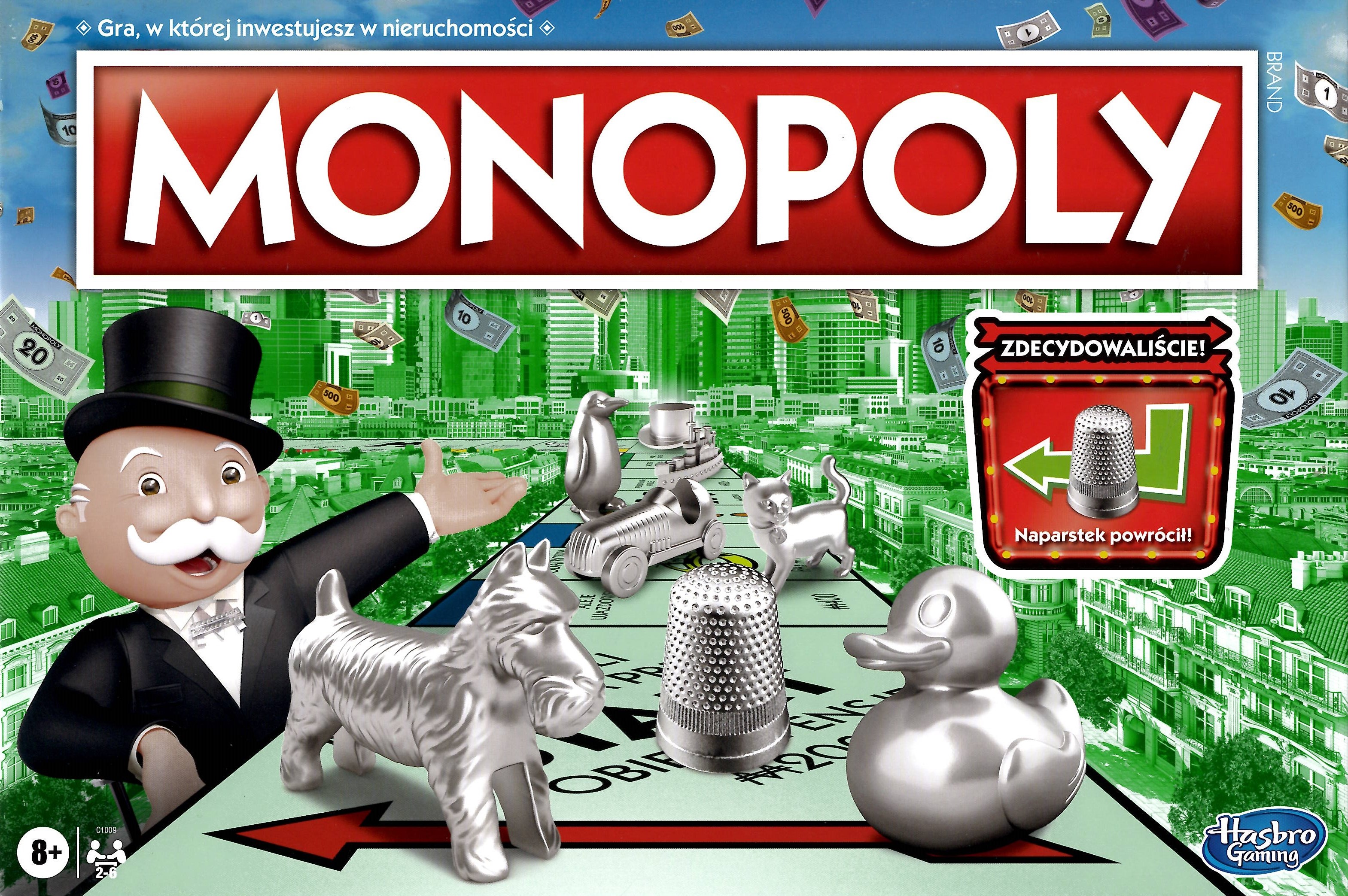 Monopoly : gra w której inwestujesz w nieruchomości. - Warszawa : Hasbro, 2021. - 1 gra (1 plansza do gry, 8 pionków, 28 kart własności, 16 kart szansa, 16 kart kasa społeczna, 32 domy, 12 hoteli, 2 kostki do gry, zestaw banknotów) :karton, tektura, kolor ; w pudełku 26x41x5 cm + instrukcja (1 karta złożona : ilustracje ; 17 cm).