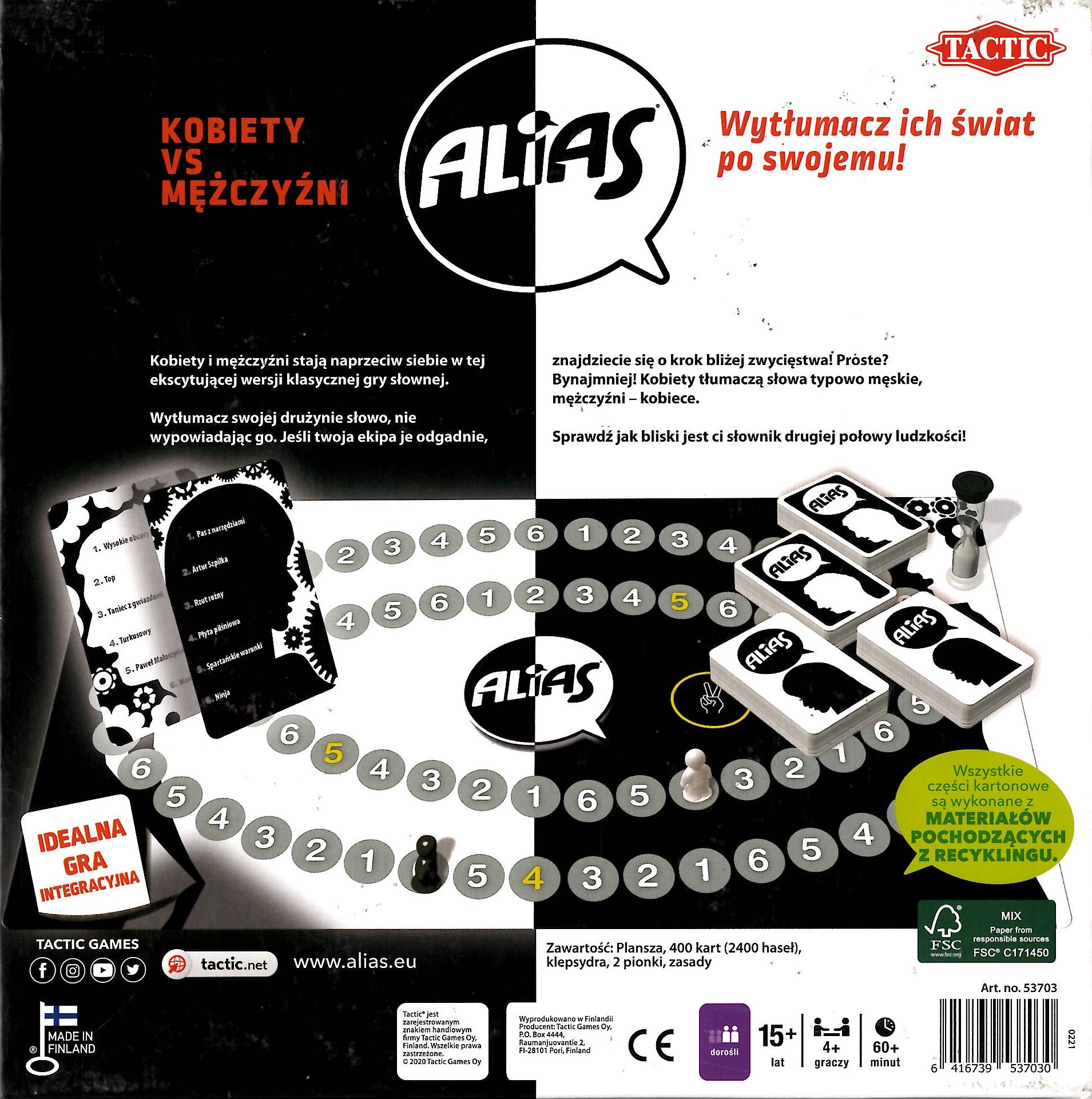 Alias : kobiety vs mężczyźni. - Pori : Tactic Games Oy, 2020. - 1 gra (1 plansza, 400 kart, klepsydra, 2 pionki) : karton, plastik, tektura ; w pudełku 25x25x6 cm+ instrukcja (2 strony : ilustracje ; 23 cm).