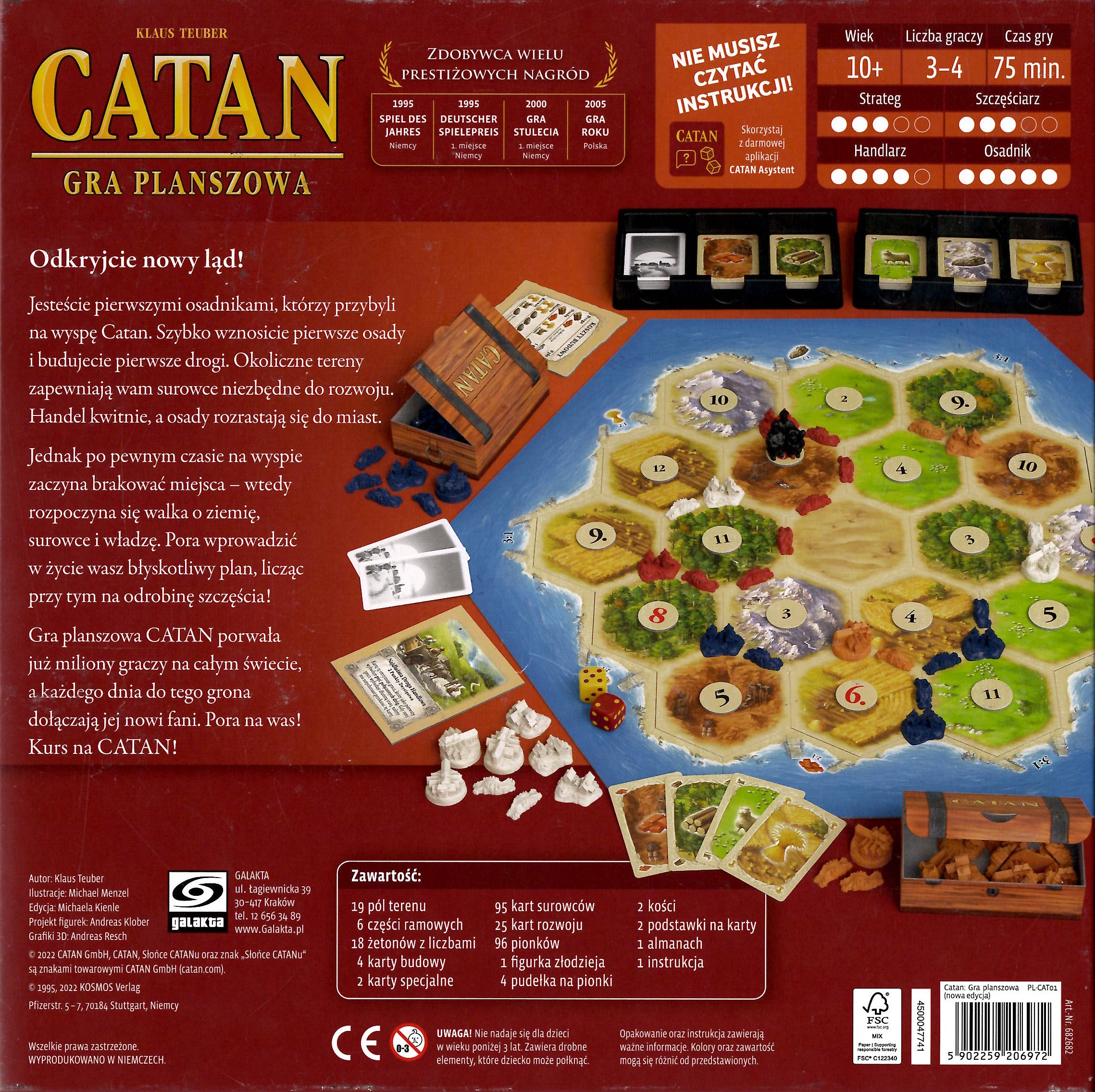 Catan / Klaus Teuber ; ilustracje Michael Menzel. - Kraków : Galakta, 2022. - 1 gra (19 pól terenu, 6 części ramowych, 18 żetonów z liczbami, 4 karty budowy, 2 karty specjalne, 95 kart surowców, 25 kart rozwoju, 96 pionków, 1 figurka złodzieja, 4 pudełka na pionki, 2 kości, 2 podstawki na karty, 1 almanach) : karton, papier, plastik, kolor ; w pudełku 30x30x7 cm + instrukcja (4 strony : ilustracje ; 28 cm).